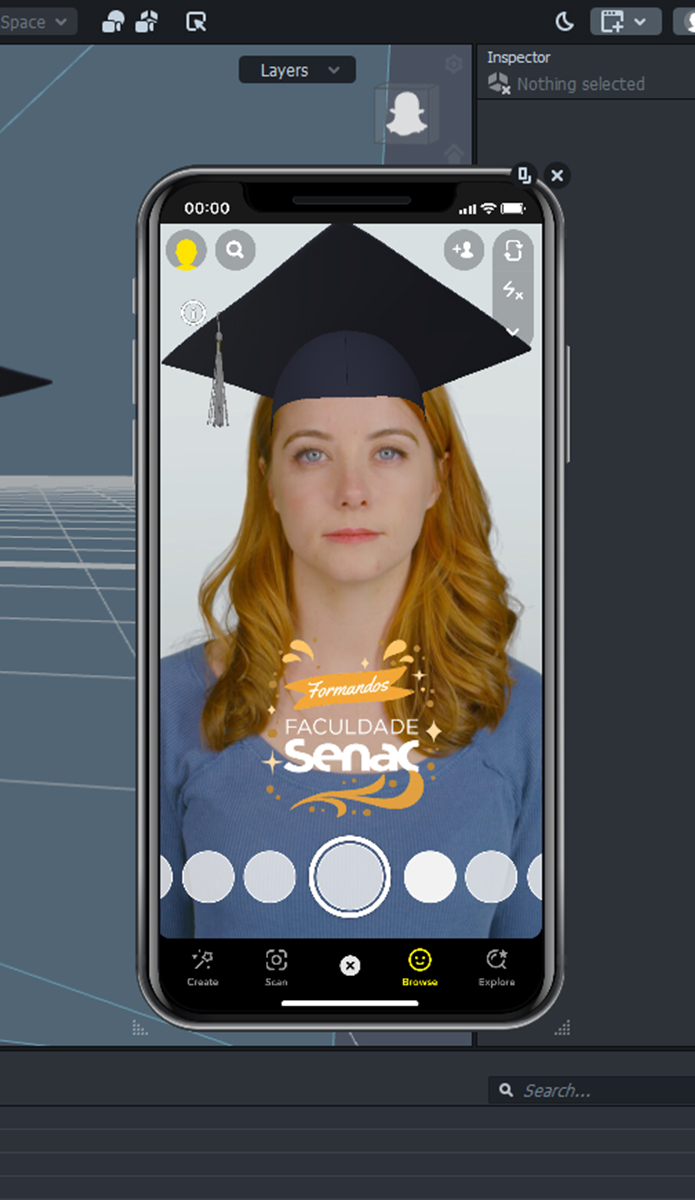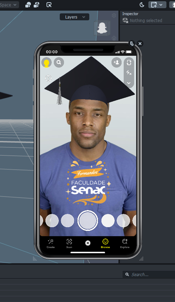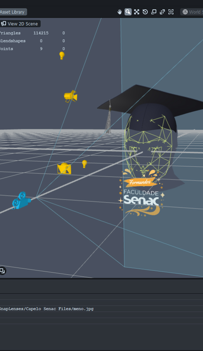 O único problema da ideia era que o melhor filtro encontrado ainda não era o ideal. O objeto 3D era escuro demais e a malha muito grosseira, havia uma tarja enorme com o nome de outra instituição nela e isso era um problema. Foi então que decidi criar o nosso próprio filtro AR, o Capelo da Faculdade Senac.